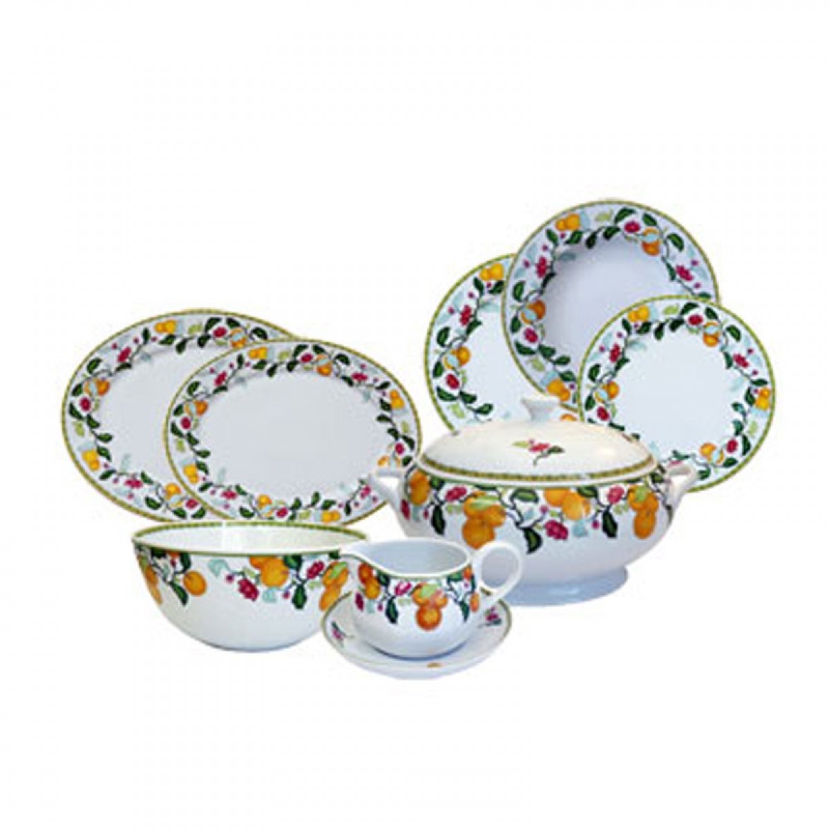 12 Pratos Rasos; 12 Pratos Sobremesa; 12 Pratos Fundos; 01 Travessa Oval G; 01 Travessa Oval M; 01 Travessa Redonda Rasa; 01 Molheira; 01 Saladeira; 01 Sopeira