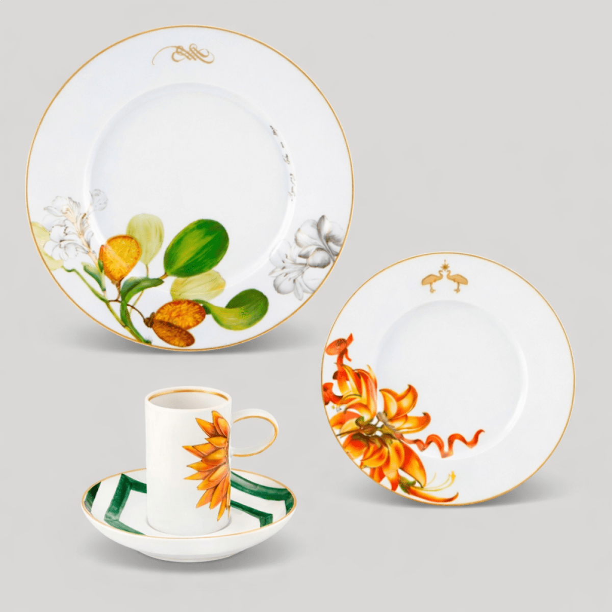 Coleção Amazônia. Inspirada na obra "Viagens Philosophicas" do naturalista Alexandre Rodrigues Ferreira, na fauna, flora e povos da Amazōnia de hoje, esta coleção foi desenvolvida em parceria com a Ecoarts Amazōnia. Aparelho de Jantar Amazônia 18 Peças: 06 Pratos Rasos, 06 Pratos Sobremesa, 06 Xícaras de Café