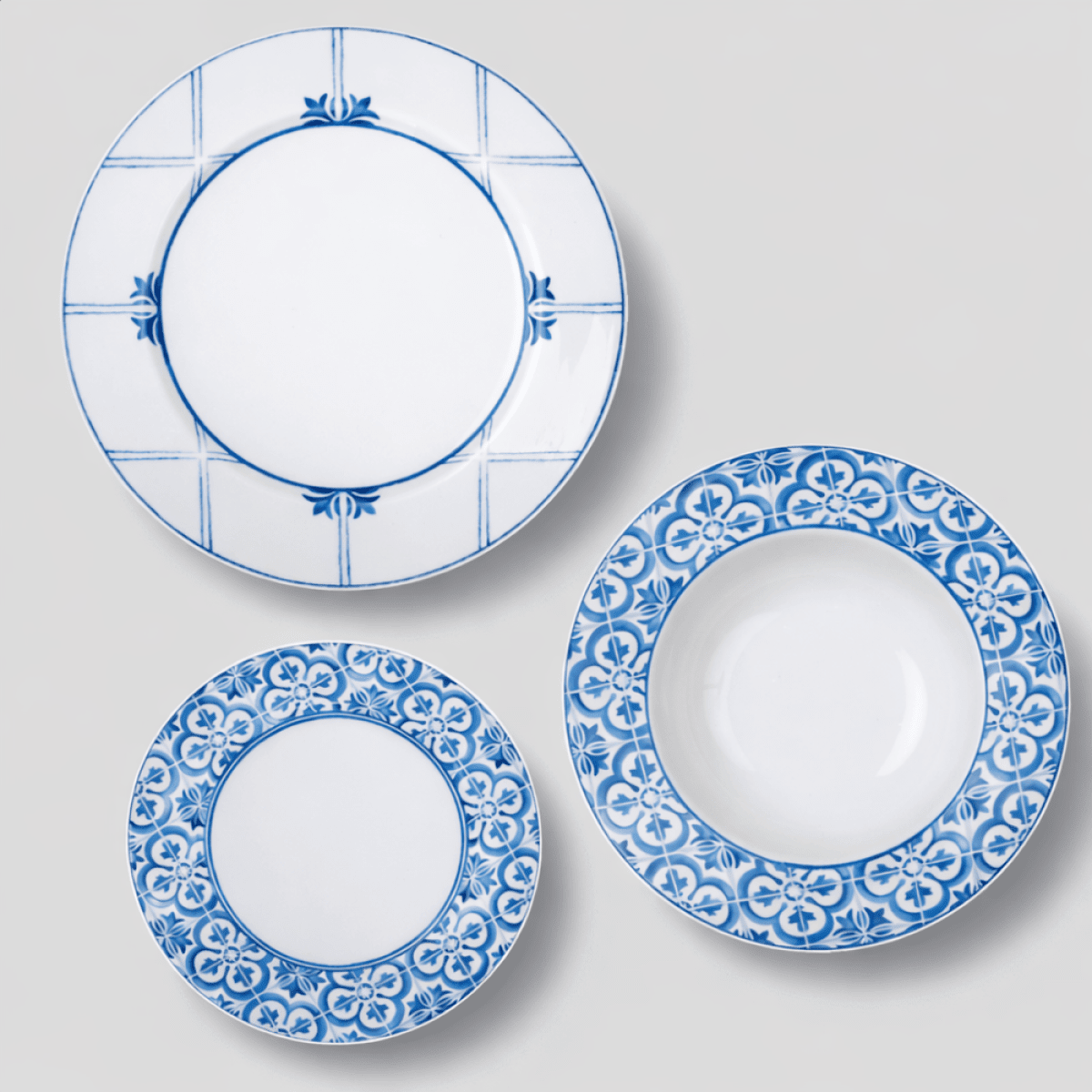 A coleção Azulejos, criada pela Matisse Casa em parceria com a tradicional Vista Alegre, celebra um dos símbolos mais marcantes da identidade portuguesa. Os azulejos, presentes há séculos na arquitetura de Portugal, contam histórias, preservam memórias e refletem a sensibilidade estética do país. Sua origem, remonta ao mundo árabe, que introduziu na Península Ibérica as técnicas de cerâmica vidrada mas, foi no século XVII, com o contato entre Portugal e as faianças de Delft, que a azulejaria portuguesa alcançou seu grande apogeu. A coleção Azulejos celebra essa herança, unindo tradição e contemporaneidade, e refletindo a excelência artesanal da Vista Alegre em diálogo com o olhar sofisticado da Matisse Casa. Aparelho de Jantar Azulejos 18 Peças: 6 prato raso; 6 prato sobremesa; 6 prato fundo