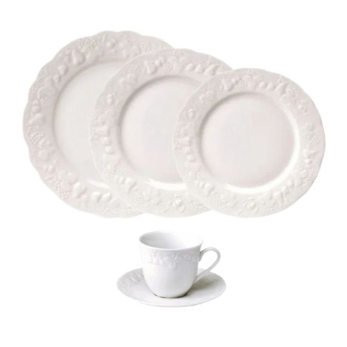 06 Pratos Sobremesa; 06 Pratos Rasos; 06 Pratos Fundo e 06 Xícaras Café