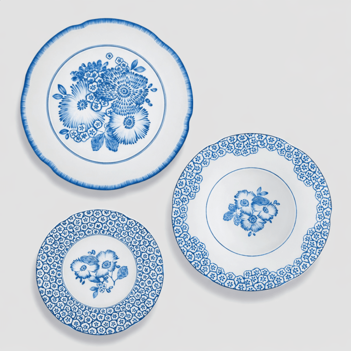 Coleção Coralina Azul. Coleção inspirada em um dos estilistas de alta costura mais reconhecido no mundo, Oscar de la Renta. Decorada com uma paleta de cores quentes e fortes, essa coleção demonstra a paixão do estilista por tons naturais e motivos florais. Porcelana portuguesa, Vista Alegre. Aparelho de Jantar Coralina Azul 18 Peças é composto por: 6 pratos rasos; 6 pratos sobremesa e 6 pratos fundo