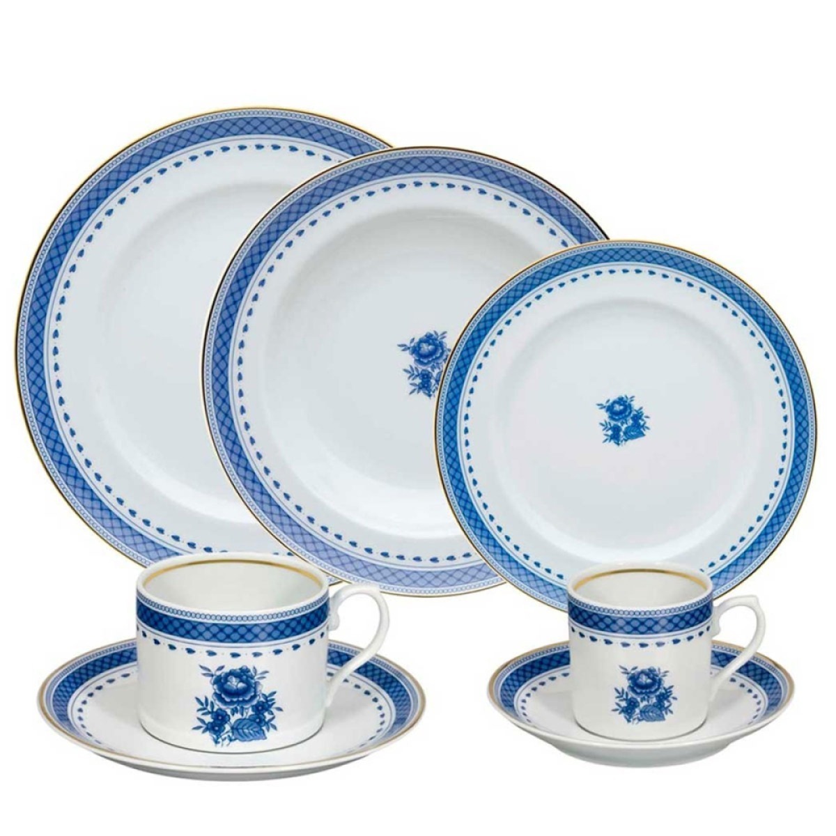 06 Pratos Rasos; 06 Pratos Sobremesa; 06 Pratos Fundos; 06 Xícaras de Café; 06 Xícaras de Chá