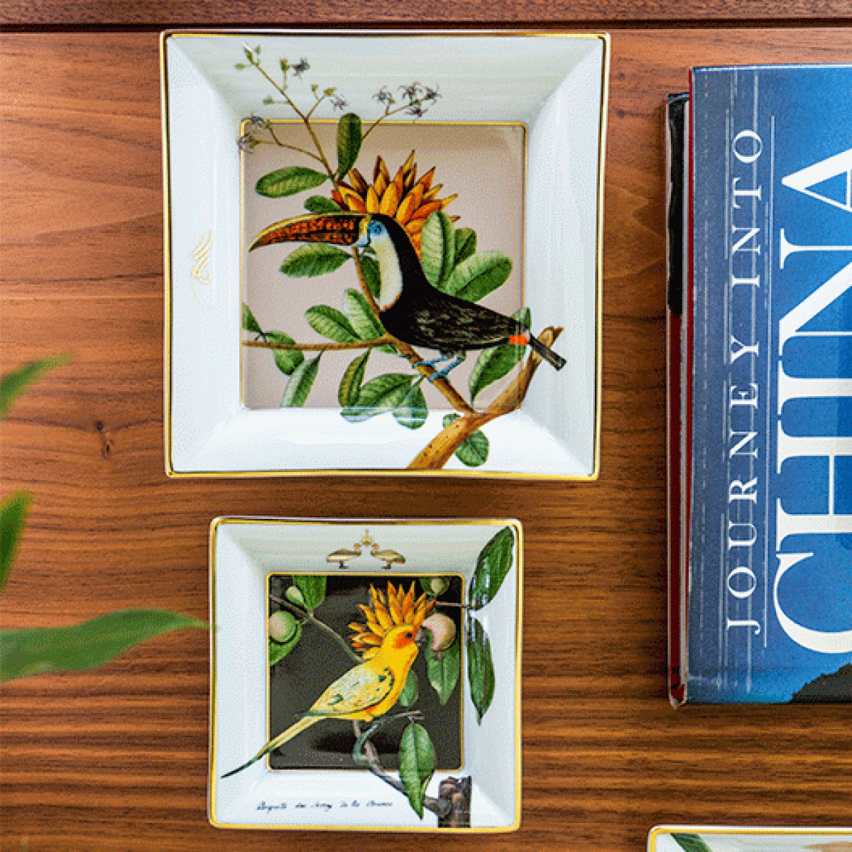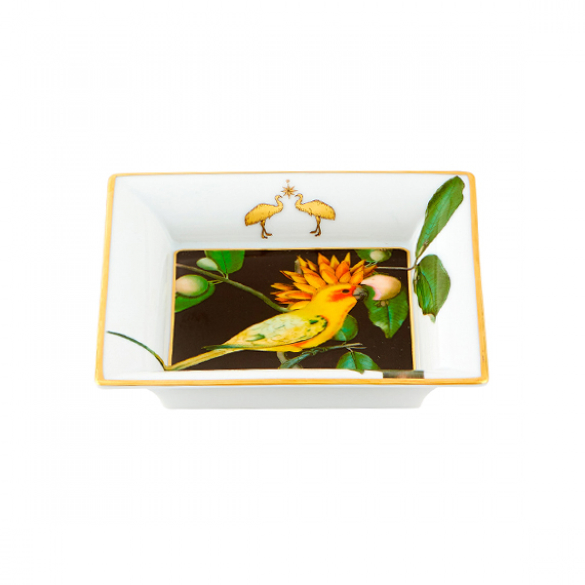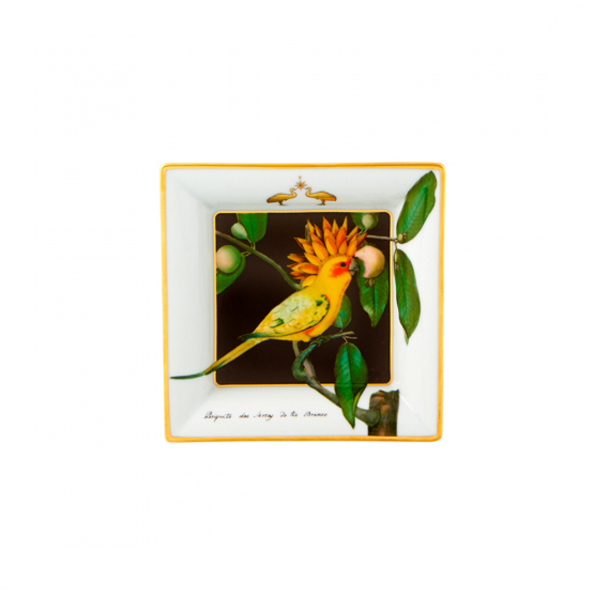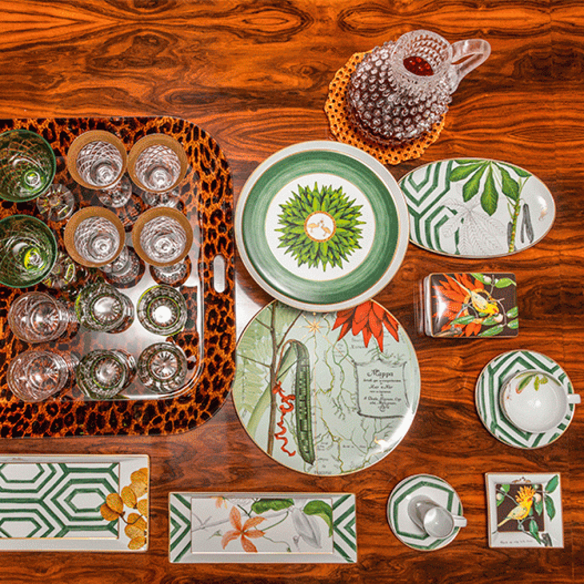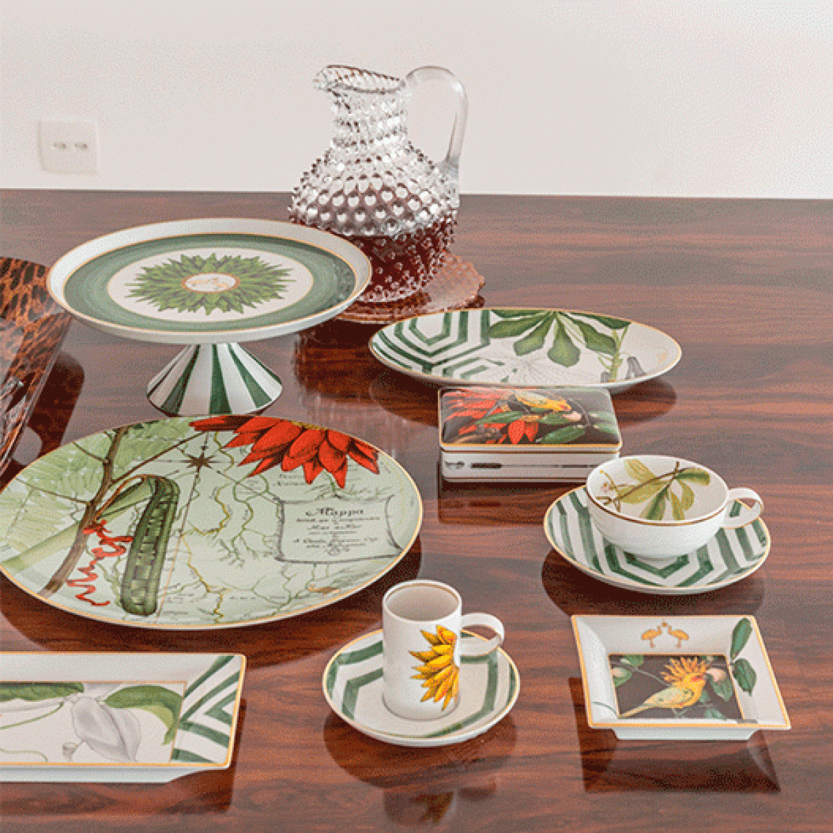 Bandeja Cascais Amazônia Vista Alegre. Inspirada na obra "Viagens Philosophicas" do naturalista Alexandre Rodrigues Ferreira, na fauna, flora e povos da Amazōnia de hoje, esta coleção foi desenvolvida em parceria com a Ecoarts Amazōnia. Elementos à ouro.