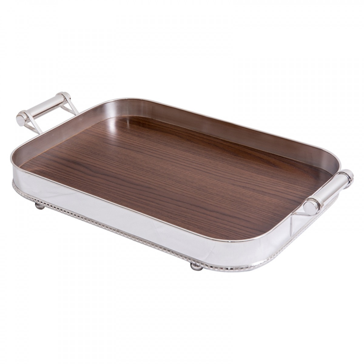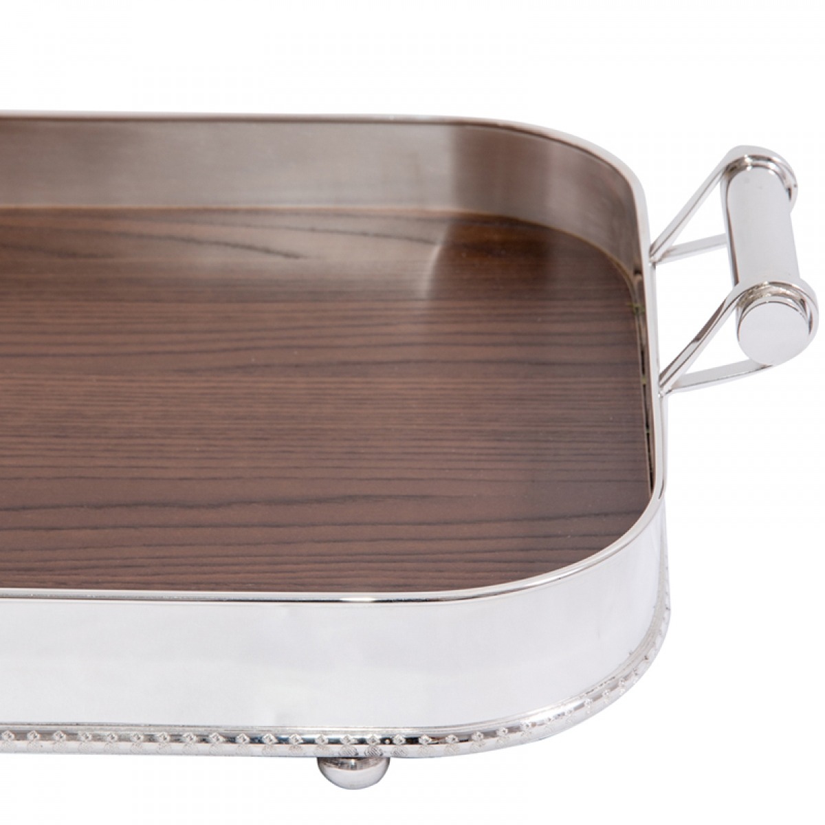 Bandeja de prata retangular St. James, com fundo de madeira e detalhe do cordão de ananás exclusivo Matisse Casa.