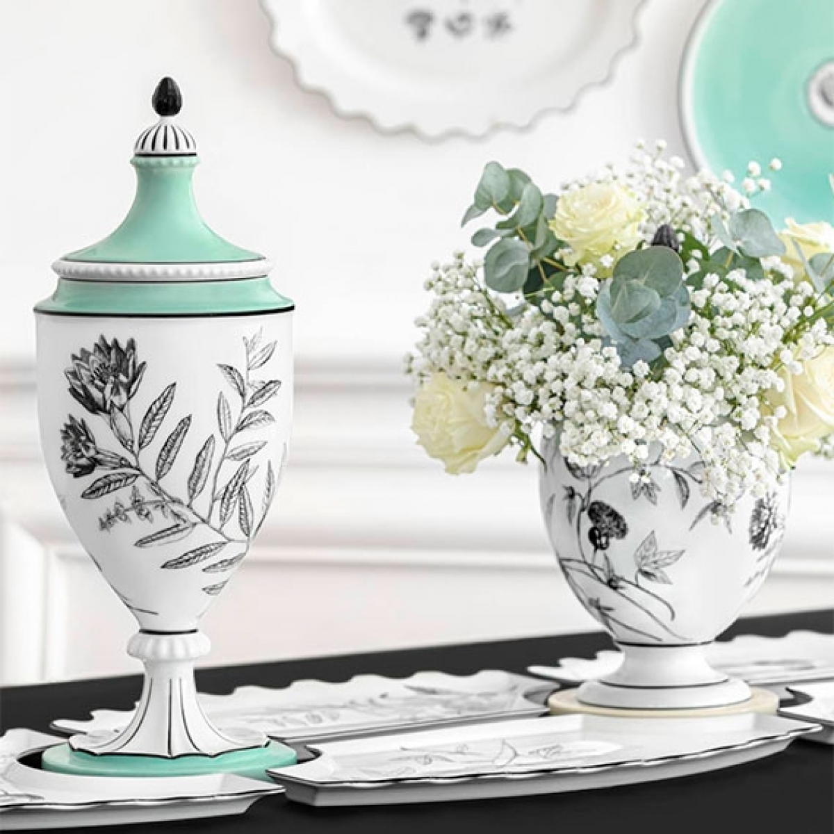 O estilista francês, Christian Lacroix, desenvolveu junto à tradicional marca de porcelanas Vista Alegre, a lindíssima Coleção Herbariae. Lacroix se inspirou em cinco flores: a papoula, o narciso, o lótus, a dália e o cardo. Cada peça foi desenvolvida no estilo da botânica antiga com um ar contemporâneo. Essa Coleção é completa com pratos, xícaras, bules, travessas, saladeiras, potiches e peças decorativas. Porcelana portuguesa Vista Alegre. Designer Christian Lacroix.