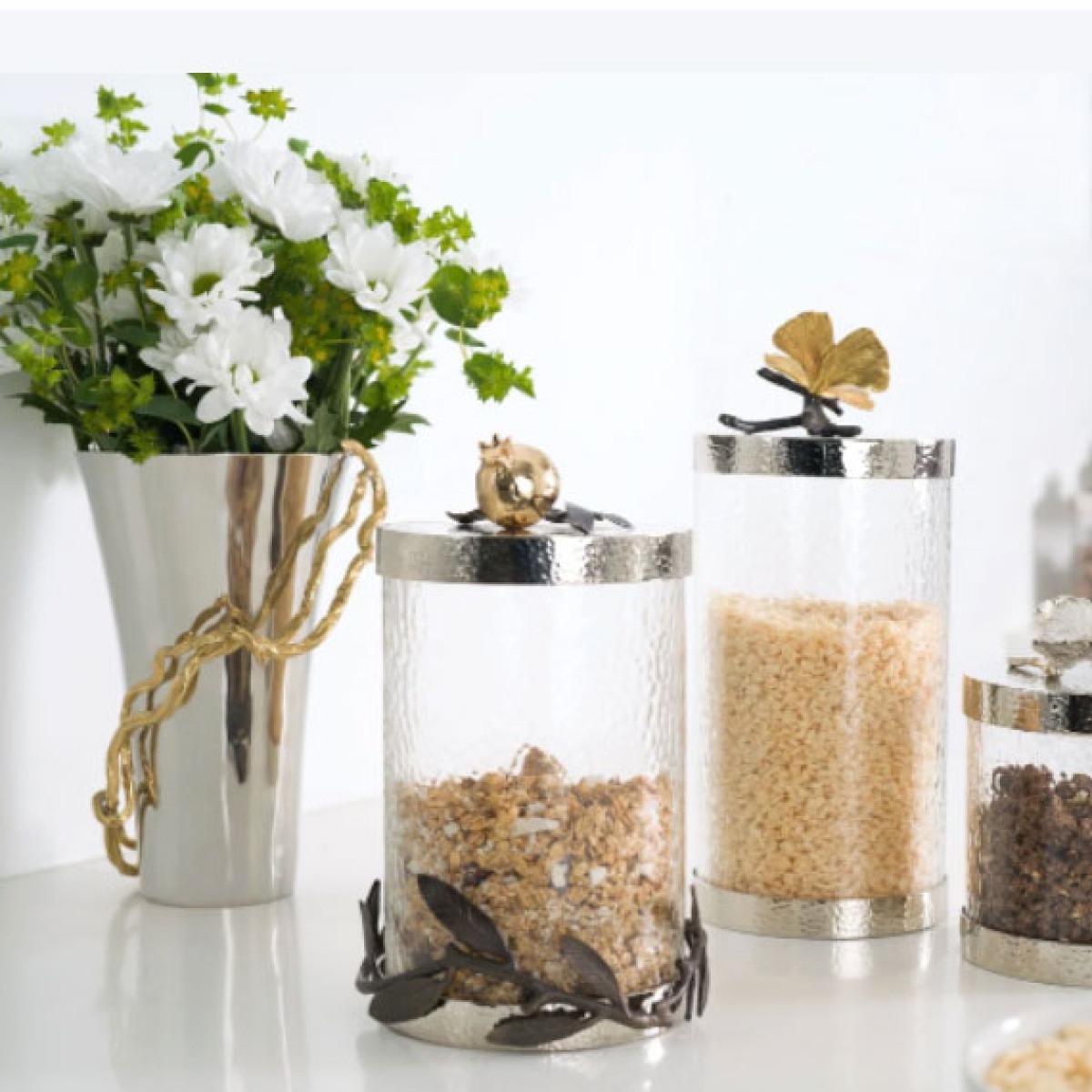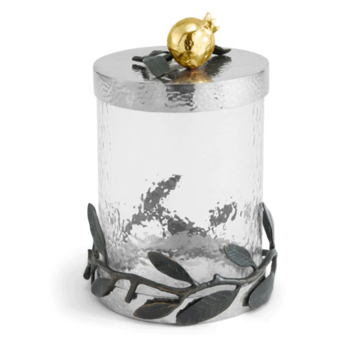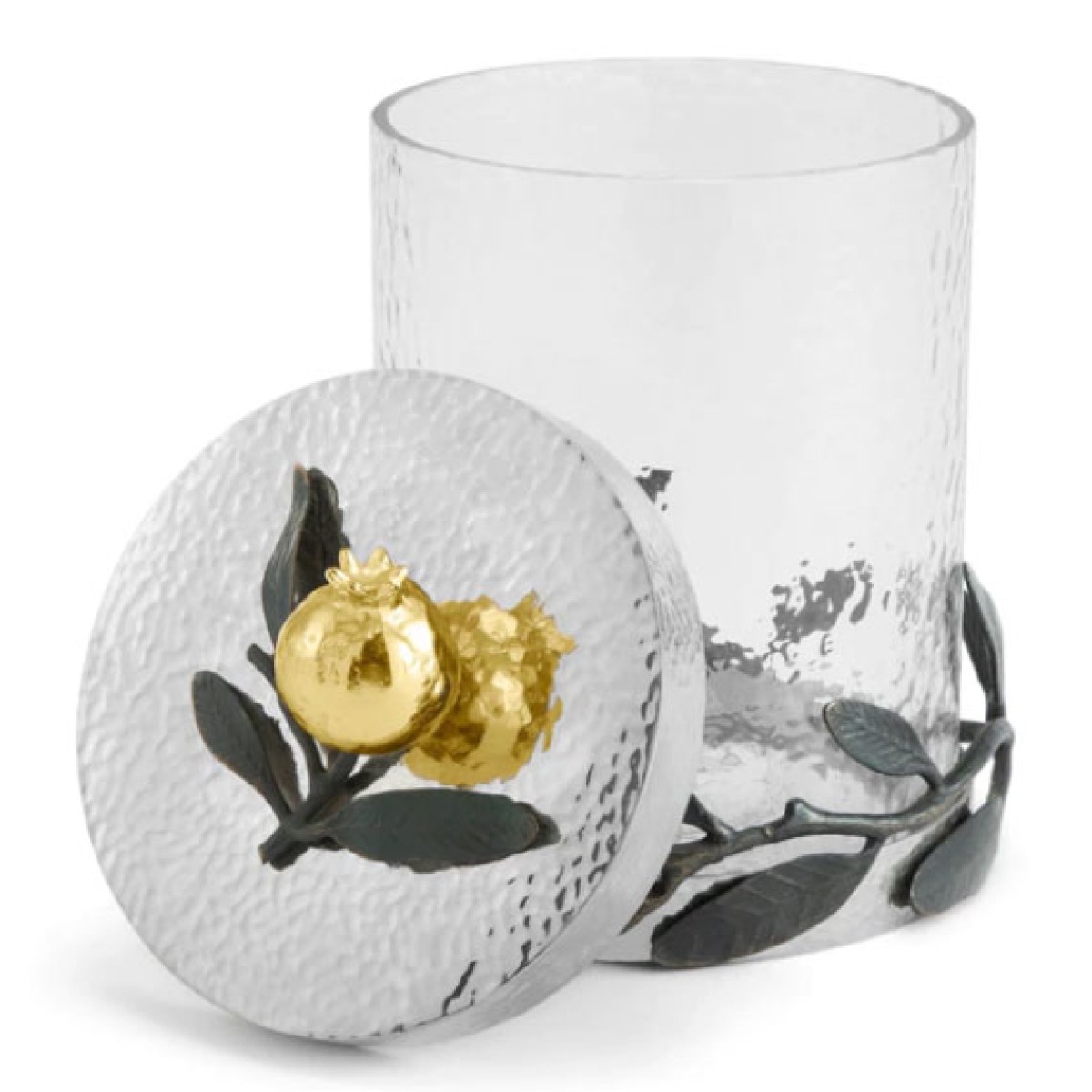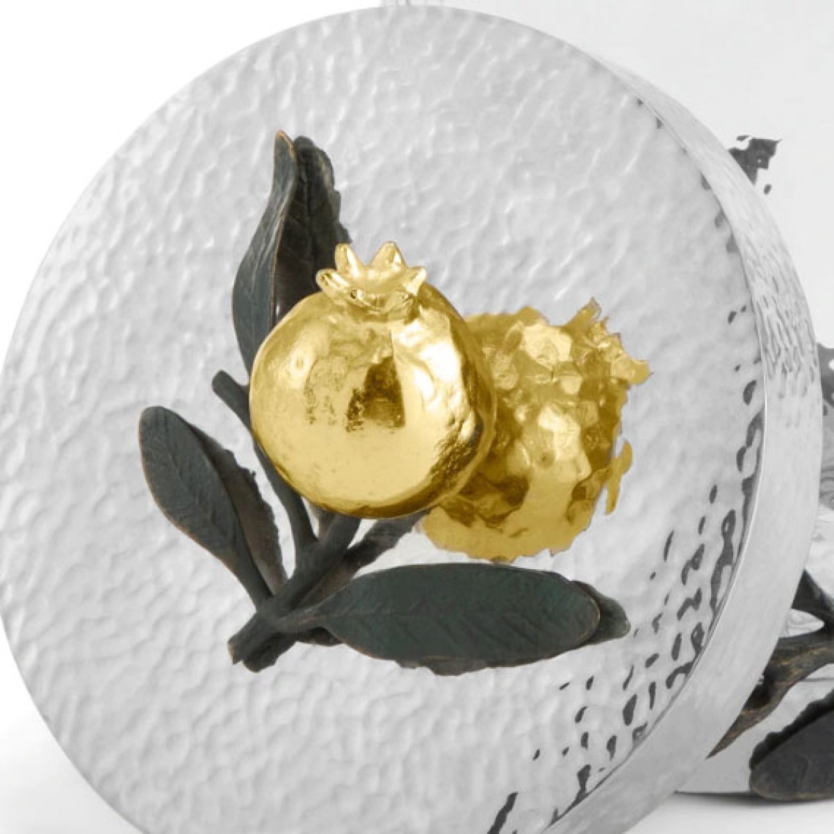 A coleção Michael Aram Romã se inspira em um dos símbolos mais universais e antigos do mundo. A fruta foi valorizada em todo o mundo, em todas as culturas e ao longo do tempo como uma representação da vida, renascimento e renovação, bem como fertilidade e união. "Eu cresci em torno de romãs - desde seu uso como corantes naturais nos tapetes antigos até como um ingrediente integral na comida que eu amo. Quando estou em minha casa em Nova Délhi, acordo cada manhã ao sabor de suco de romã espremido na hora. A cor, o cheiro, o sabor delicado, tudo isso faz com que pareça um elixir mágico para mim."