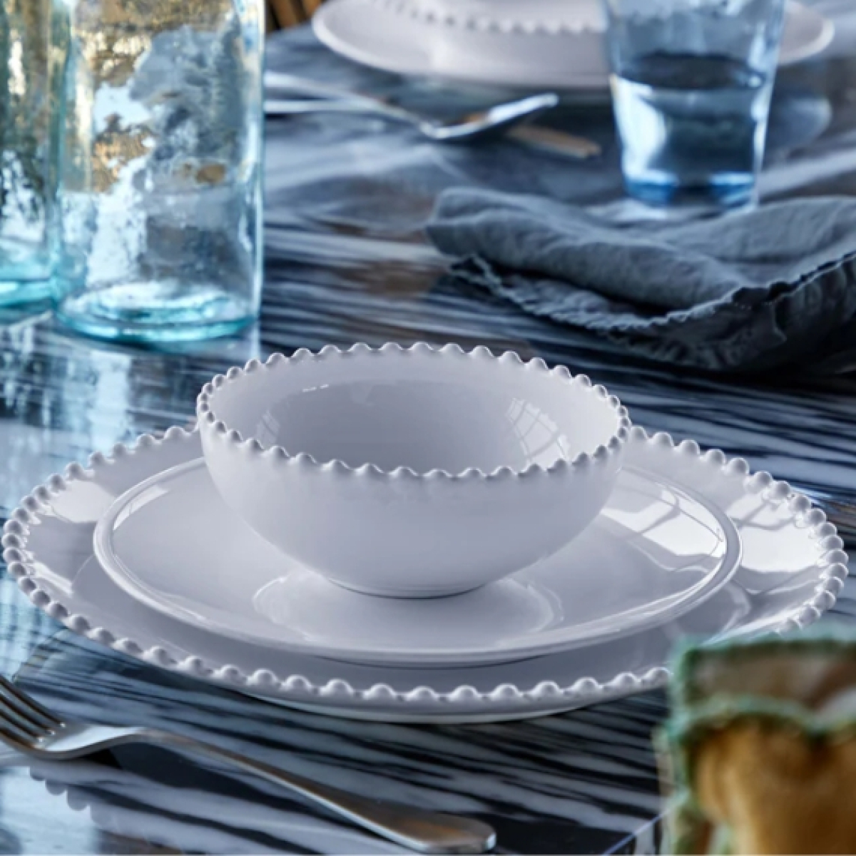 O Bowl, em grés fino e fabricada em Portugal, apresenta um rebordo decorado com pérolas e acabamento escovado à mão, conferindo-lhe um toque único e artesanal.