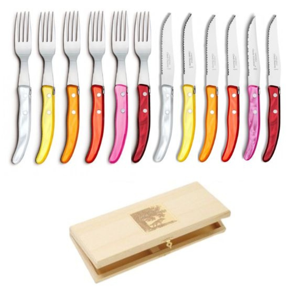 Caixa com 6 Facas e 6 Garfos Claude Dozorme Laguiole Coloridas