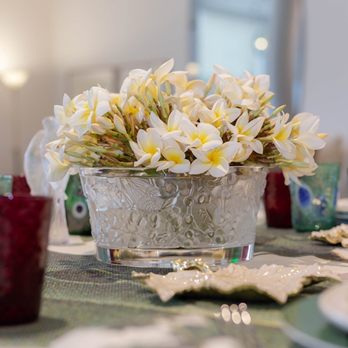 Em 1928, René Lalique criou os painéis decorativos Merles & Raisins, originalmente em vidro branco prensado sobre fundo prateado, para adornar a marchetaria de mogno cubano do mítico Expresso do Oriente. O Studio Lalique reinterpreta esta criação icônica hoje e dá a ela uma nova expressão por meio de vasos e um centro de mesa. A preciosa herança cultural da Maison, portanto, ganha vida em outras formas-
