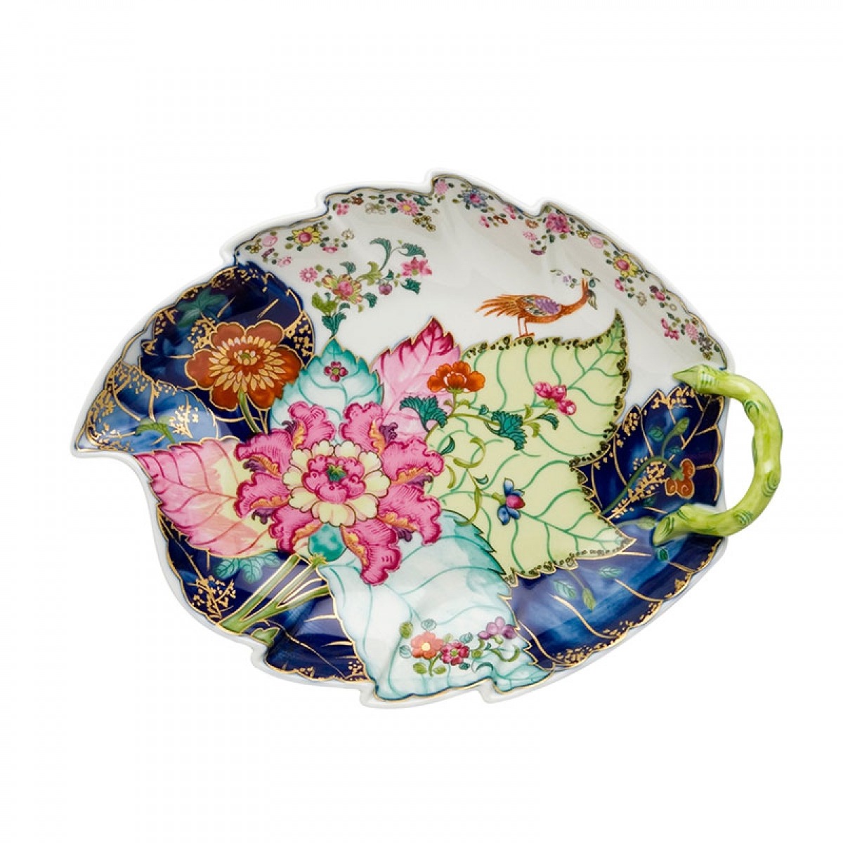 Concha América Tobacco Leaf. Esta extravagante decoração teve origem na China, produzida para exportar especialmente para os mercados português e brasileiro. Uma pequena fénix pousa na folhagem de nicotina em flor são vinte e sete cores e ouro de 22 k compõem esta decoração.