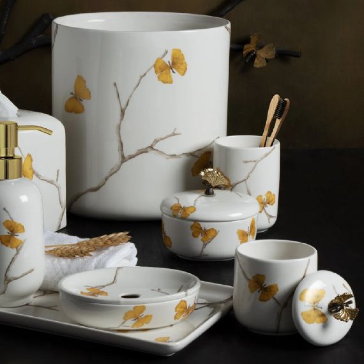 A Coleção Butterfly celebra a representação da flora como fauna. O fascínio de Michael por um tipo particular de árvore ginkgo, ou “Ginkgo Borboleta”, que cresce com uma folha dupla que lembra as asas de uma borboleta, deu origem a uma imagem fantasia da planta. Executado no mais alto nível de artesanato, cada peça é processada em latão maciço com vasos em forma de casulo gravados à mão. As peças da coleção são um tour de force do processo artesanal, capturando o espírito poético que é tão profundamente indicativo do trabalho de Michael. “A primeira vez que vi esta árvore, literalmente parecia que tinha sido completamente tomada por borboletas... A ideia de que as folhas pudessem evocar a beleza das borboletas era mágica para mim, como as árvores que podem se metamorfosear da flora para a fauna em um piscar de olhos.” -M