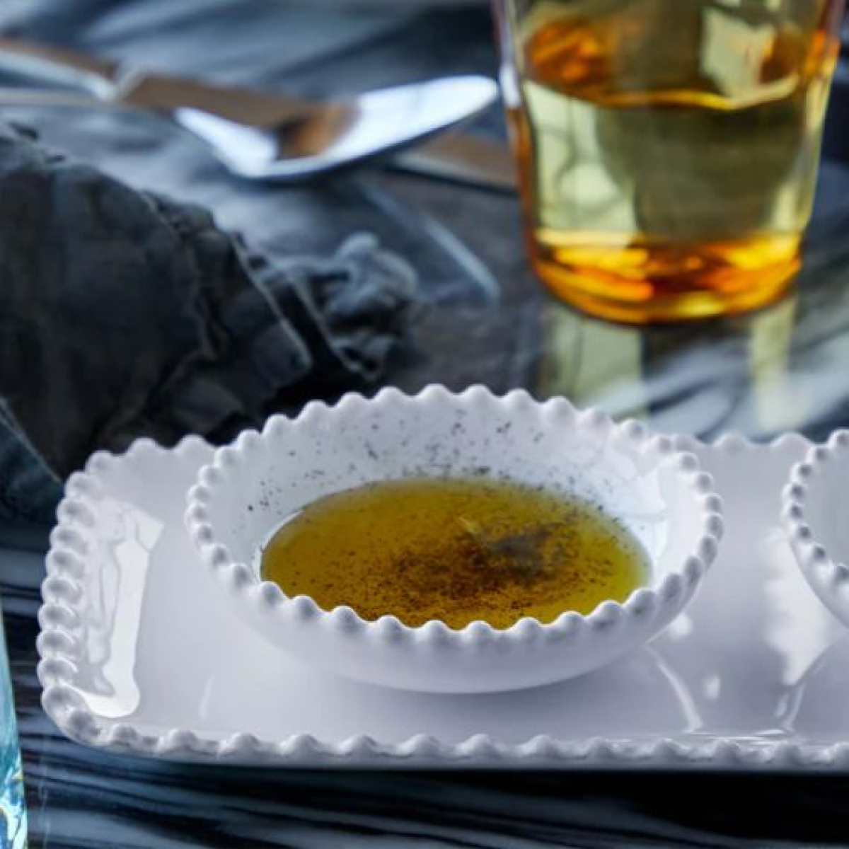 O Mini Bowl, em grés fino e fabricada em Portugal, apresenta um rebordo decorado com pérolas e acabamento escovado à mão, conferindo-lhe um toque único e artesanal.