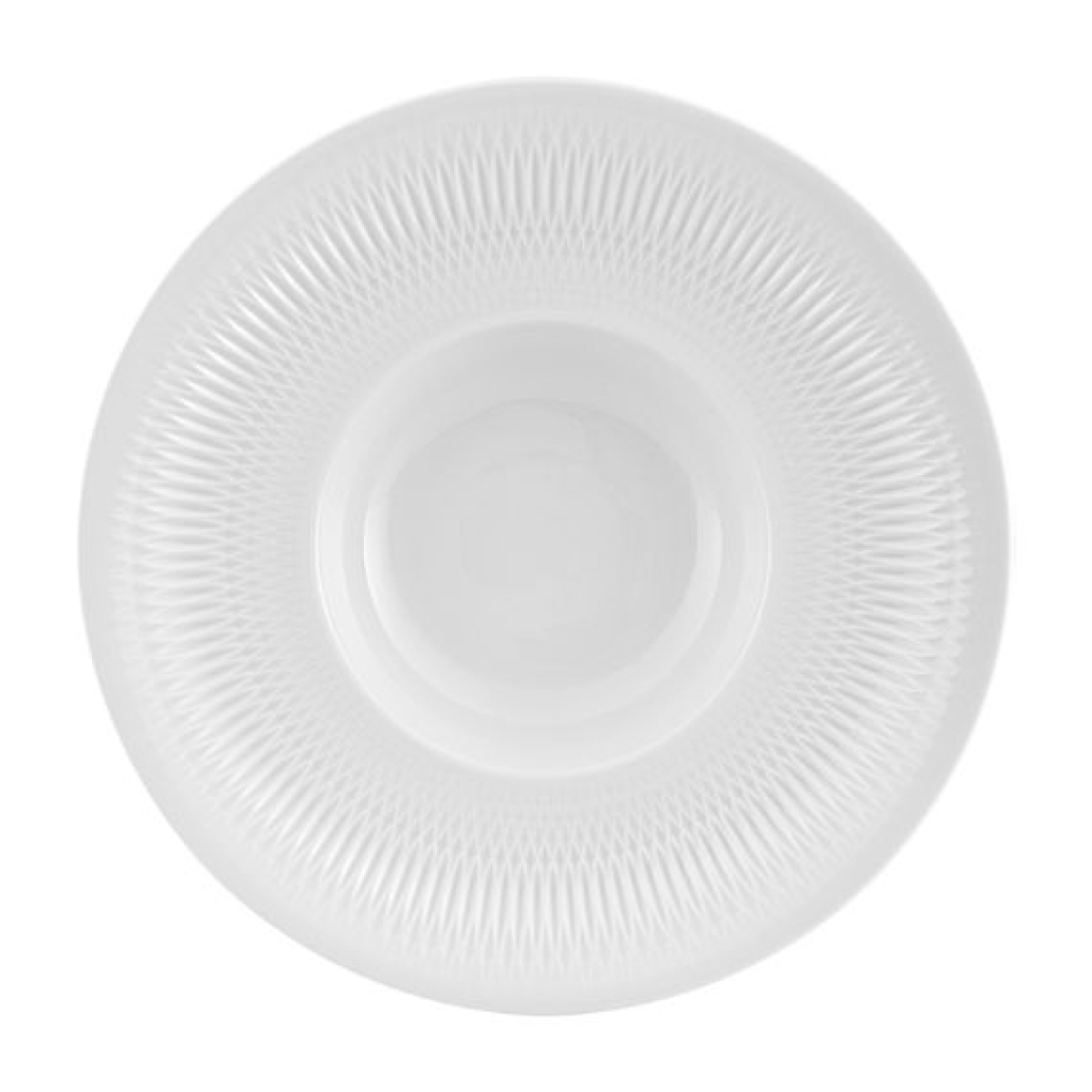 Prato Sopa Utopia. Cada peça de Utopia apresenta uma construção de relevos diferentes que se adapta à forma, inspirada em geometrias japonesas, realçando-a e conferindo-lhe dinamismo.