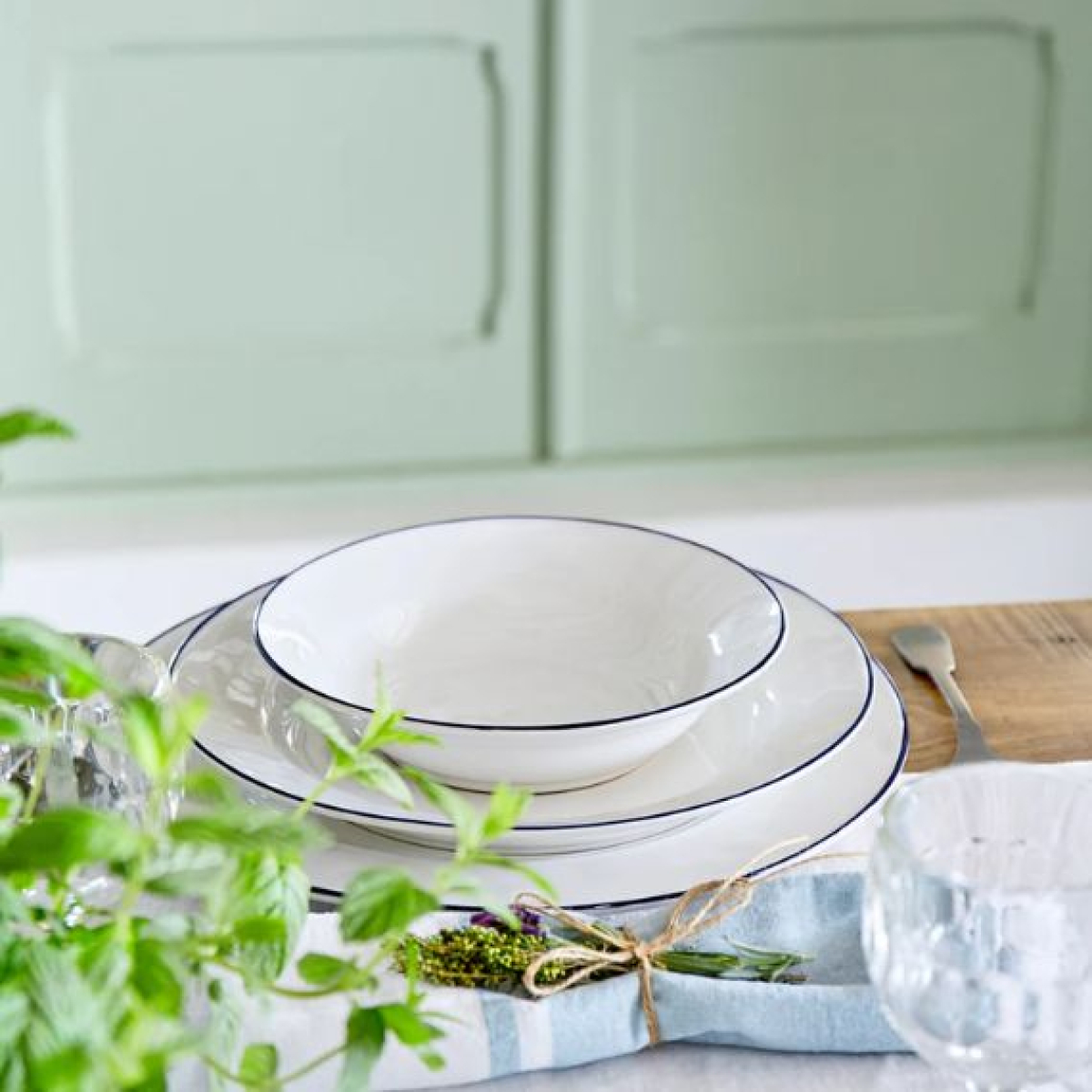 Linha elegante e contemporânea, a coleção Beja acrescenta um look simultaneamente sofisticado e casual a qualquer mesa. Com linhas graciosas, todas as peças da coleção apresentam um rebordo de cor azul marinho. Grés fino. Fabricado em Portugal.