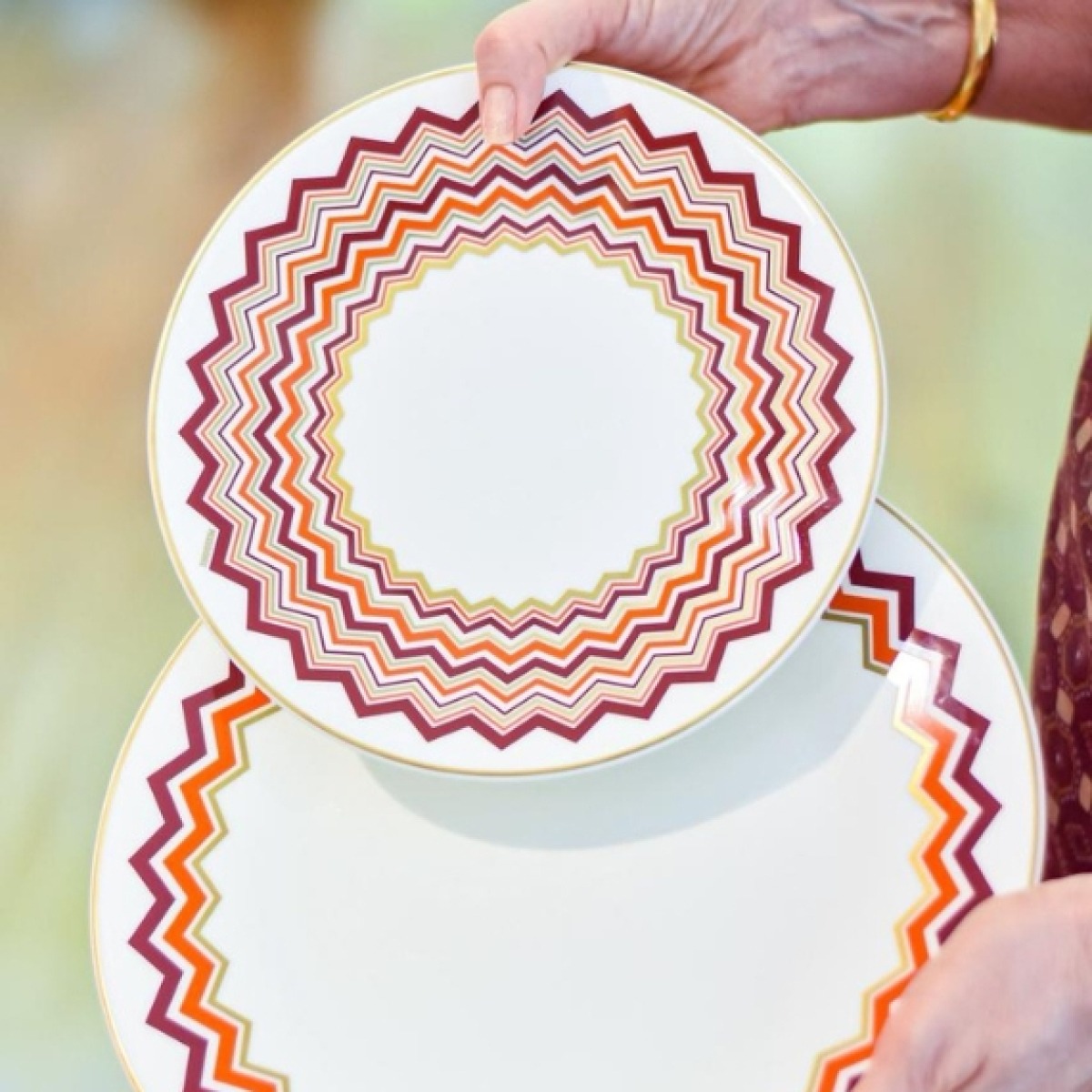 Prato Raso Iconic da icônica marca italiana Missoni Home. Fundada em 1953 por Rosita e Ottavio Missoni, a marca Missoni começou como grife de roupas. Com o tempo essa estética migrou da moda para o universo da casa: surge a Missoni Home com peças de tableware e decoração.