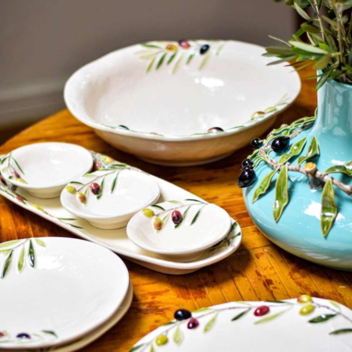 A coleção Olival é uma linha de mesa inspirada na oliveira e na paisagem alentejana, com seu casario caiado. Sobre o branco surgem as diferentes texturas do tronco e dos ramos da oliveira, e azeitonas em diferentes tons de maturação - todos eles elementos pintados manualmente. É uma linha de mesa que é uma verdadeira homenagem ao saber fazer português, com o cunho inconfundível da Bordallo Pinheiro.