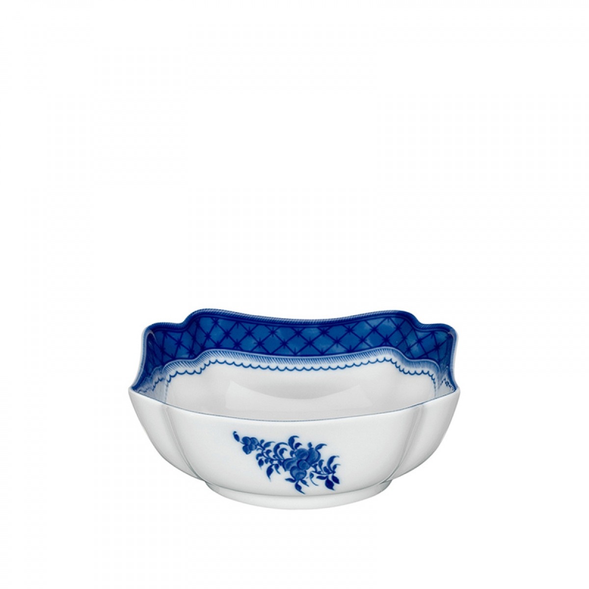 Saladeira Quadrada Pequena Blue Canton. A porcelana decorada a branco e azul, nos padrões “Cantão” e “Nanking”, foi muito apreciada na era vitoriana e era exclusiva dos mais abastados, fazendo parte das mesas mais elegantes da época.