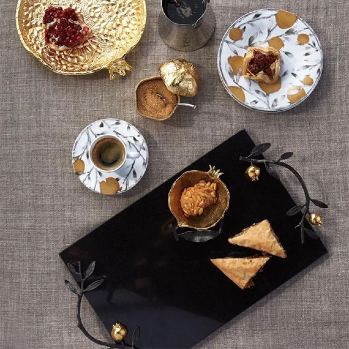A coleção Michael Aram Romã se inspira em um dos símbolos mais universais e antigos do mundo. A fruta foi valorizada em todo o mundo, em todas as culturas e ao longo do tempo como uma representação da vida, renascimento e renovação, bem como fertilidade e união. "Eu cresci em torno de romãs - desde seu uso como corantes naturais nos tapetes antigos até como um ingrediente integral na comida que eu amo. Quando estou em minha casa em Nova Délhi, acordo cada manhã ao sabor de suco de romã espremido na hora. A cor, o cheiro, o sabor delicado, tudo isso faz com que pareça um elixir mágico para mim."