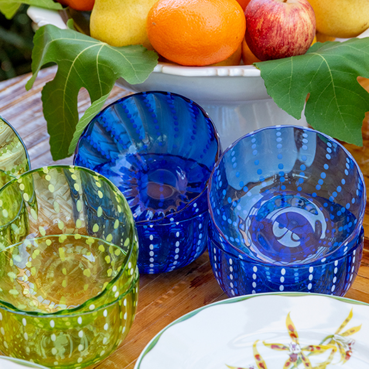As peças da Coleção Perle Zafferano tem design de Federico de Majo e são fabricadas inteiramente à mão por artesãos extremamente habilidosos com pasta de vidro.