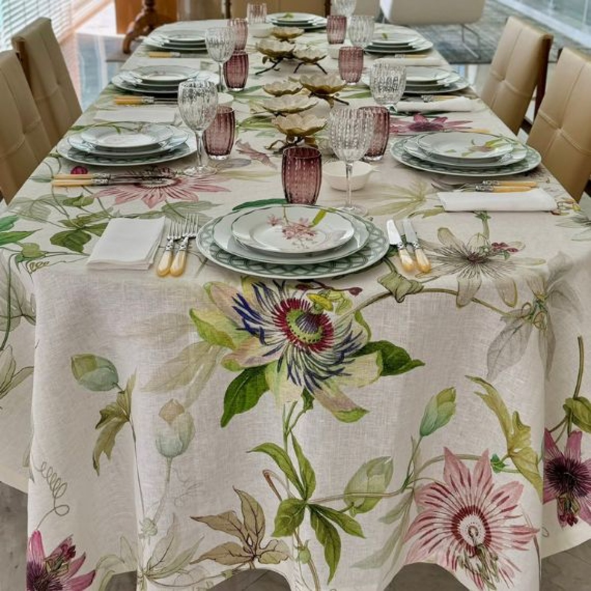 A Toalha de mesa Granadilla Tessitura Toscana, é fabricada em uma região da Itália renomada pela excelência em tecidos. A estampa Granadilla tem desenhos e cores sutis inspirados nas flores de maracujá. Com linho de alta qualidade é perfeita para quem valoriza elegância e durabilidade, ideal para o uso diário ou para ocasiões especiais.