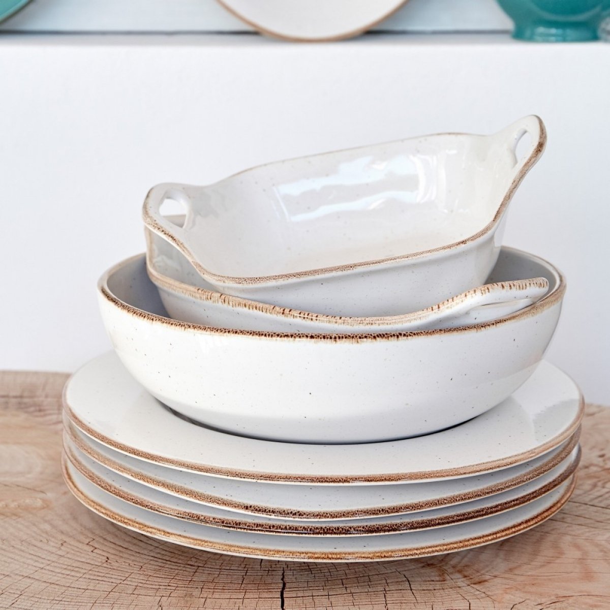 Sardegna tem o estilo artístico da criação de um oleiro. A coleção inclui louças de tamanho generoso e uma grande variedade de utensílios e acessórios que são incrivelmente duráveis, mas moderadamente leves. A paleta de cores - branco, turquesa profundo e a nova cor cinza suave - é inspirada nos tons naturais vistos na costa da Sardenha. Todas as peças são feitas à mão com um esmalte de aparência rústica ao redor da borda.