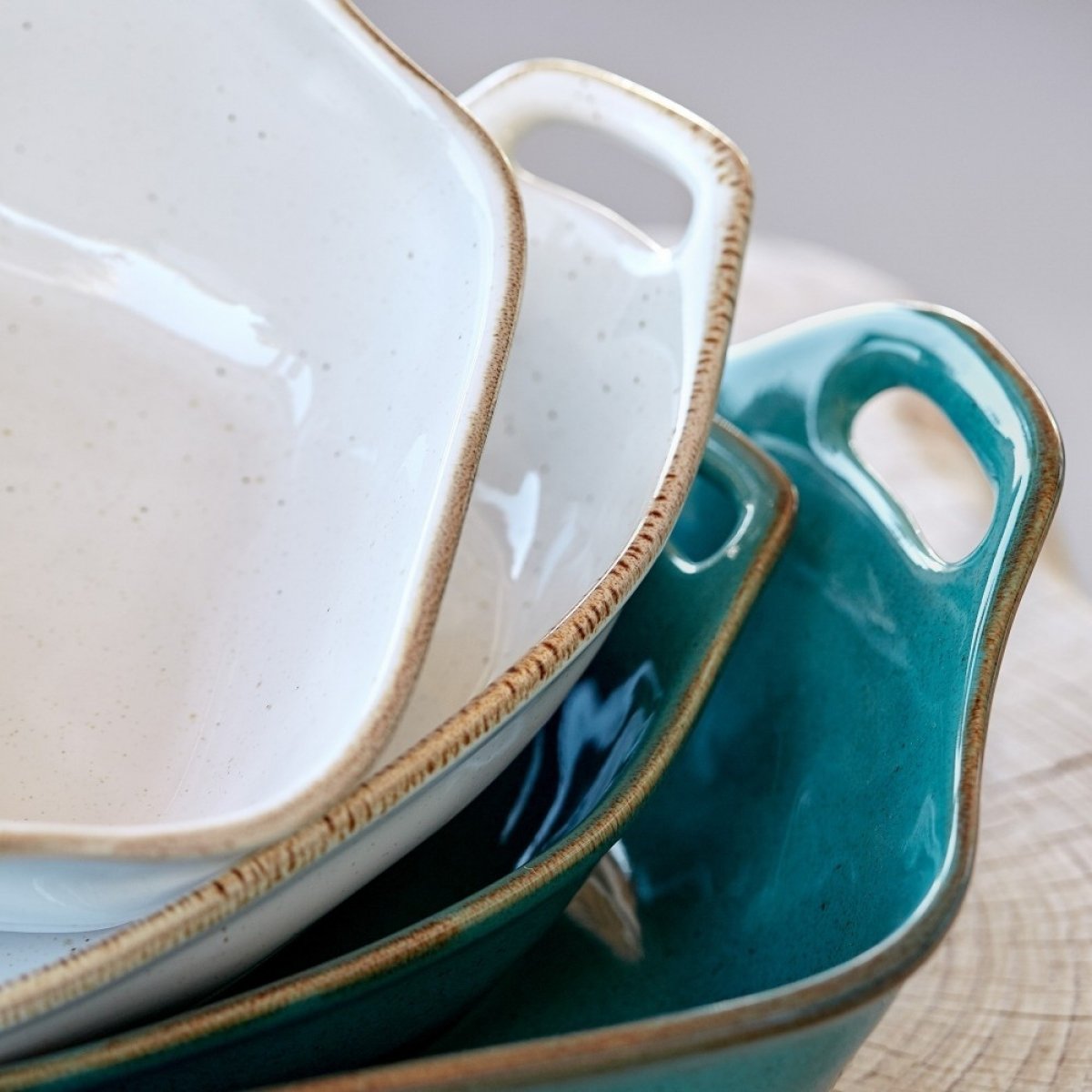 Sardegna tem o estilo artístico da criação de um oleiro. A coleção inclui louças de tamanho generoso e uma grande variedade de utensílios e acessórios que são incrivelmente duráveis, mas moderadamente leves. A paleta de cores - branco, turquesa profundo e a nova cor cinza suave - é inspirada nos tons naturais vistos na costa da Sardenha. Todas as peças são feitas à mão com um esmalte de aparência rústica ao redor da borda.