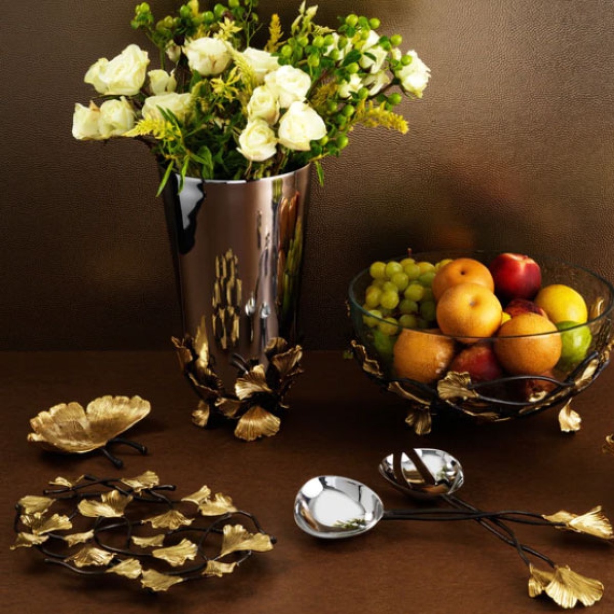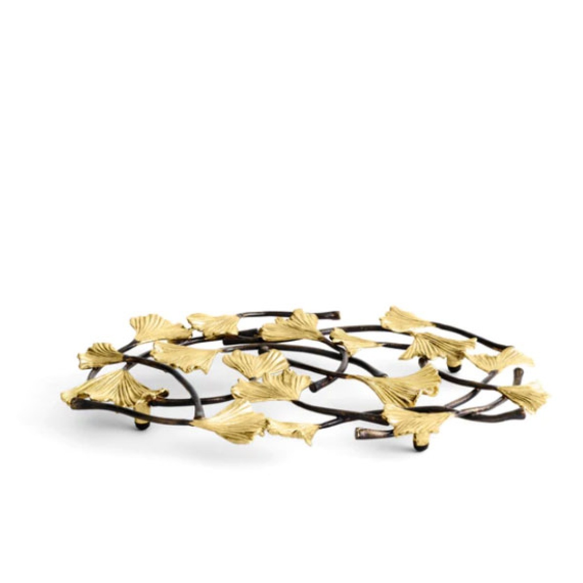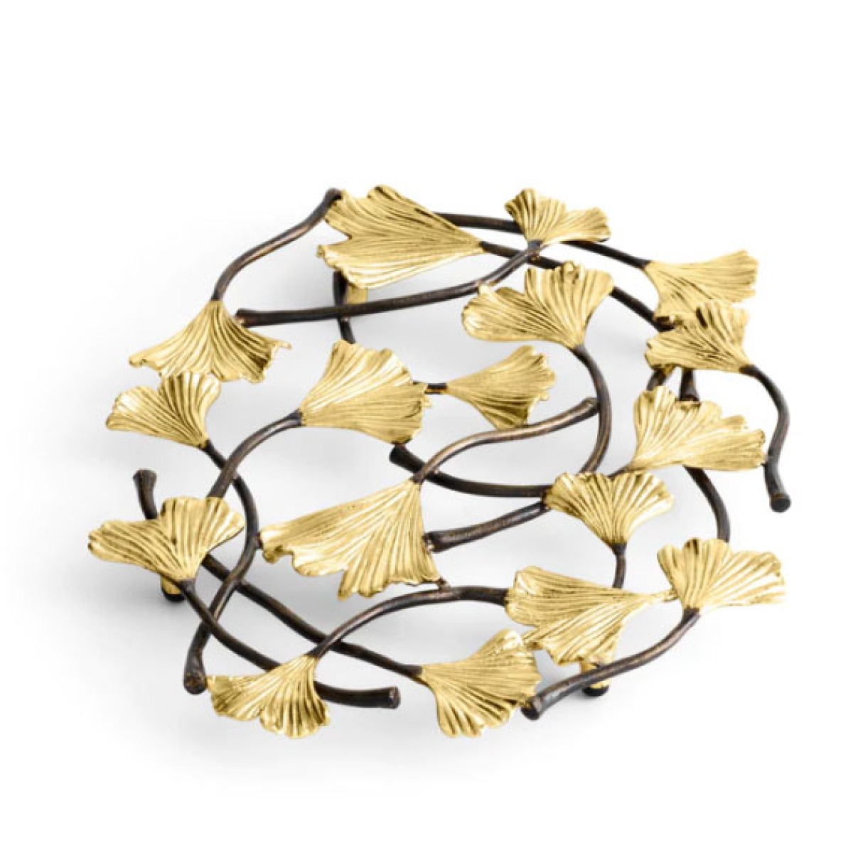 A coleção Ginkgo inspira-se nas complexidades de forma e textura encontradas na folhagem de todo o mundo. Ao interpretar formas vegetais em metal fundido, Aram apresenta um trabalho que evoca um ambiente natural transformado e redefinido. “Essas peças tem folhas maravilhosamente onduladas, que criam uma superfície quase rococó de formas lúdicas, delicadas e intrincadas. Ao combinar as folhas esculpidas individualmente, as formas naturais se unem para criar um padrão complexo. Tentei capturar essa sensação de movimento e fragilidade no metal.” - M