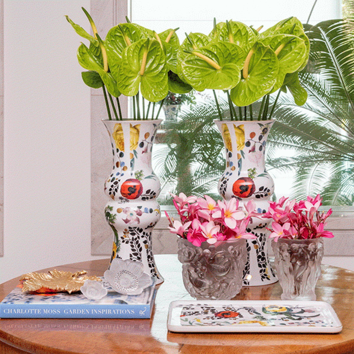 Vaso Primavera. Dálias magenta, papoilas púrpura e amores-perfeitos amarelos misturam-se com uma vegetação luxuriante que parece escapar de um labirinto de listas imaculadas. Com elementos à ouro e prata e elementos de pintura à mão.